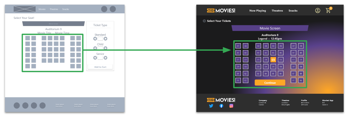 To make seat selection easier to understand, a numbering system was added to each available seat within the movie theater. As a result, this increased the scope of the project.