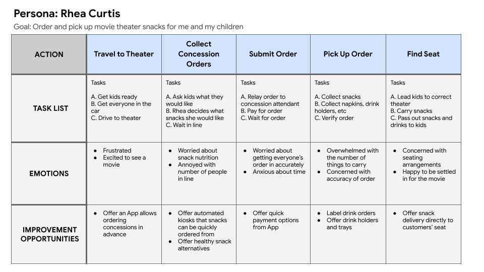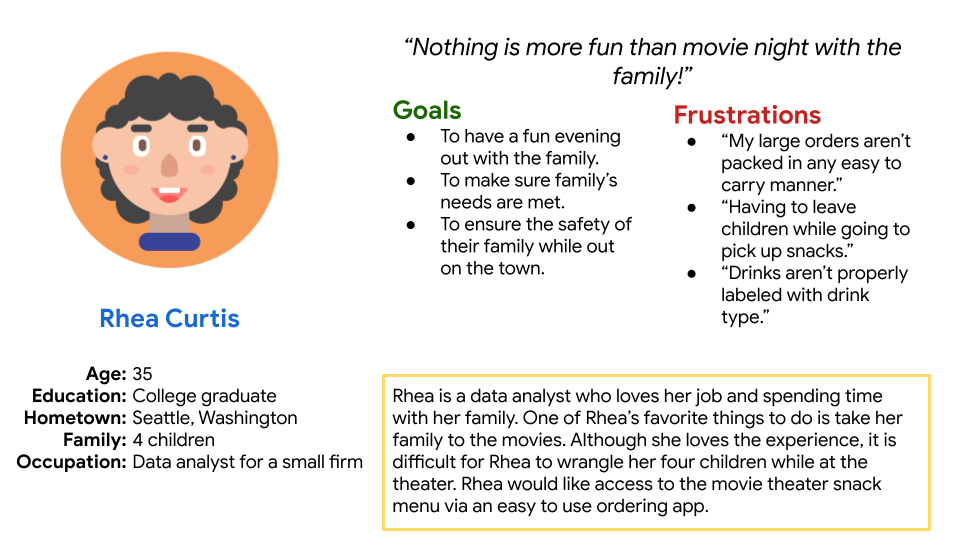 Personas were created from the gathered user data. For example: Rhea, who is an avid moviegoer, enjoys snacks while watching movies with her kids, but is often strapped for time.