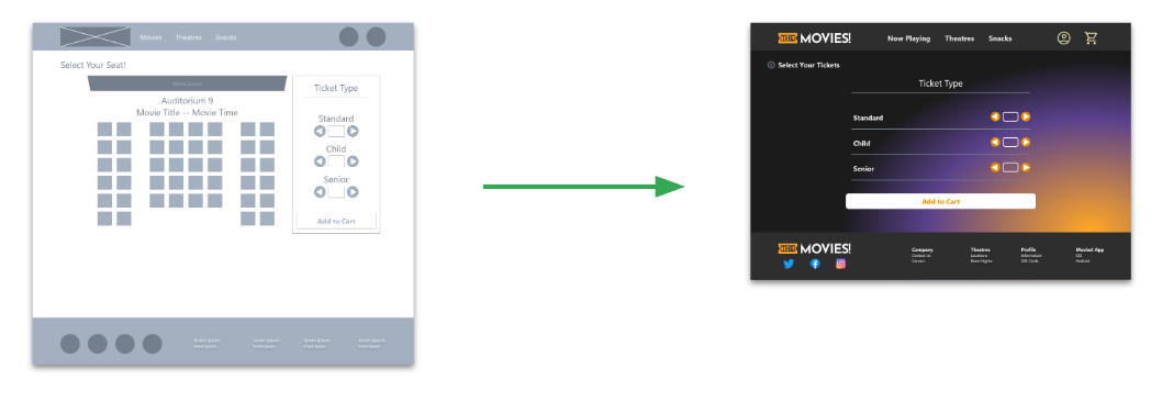 The ticket selection screen was identified as good place to incorporate snack orders. Based on insights from the usability study, the flow was altered to allow the users to select the number of tickets and ticket types on a separate screen. This gave the users a better understanding of the quantity and type of tickets they were adding to their cart.