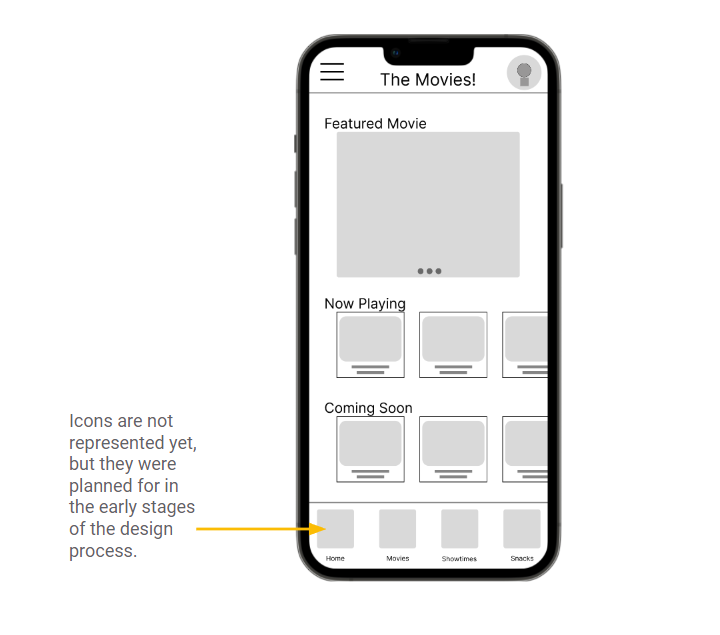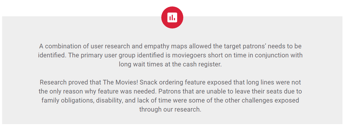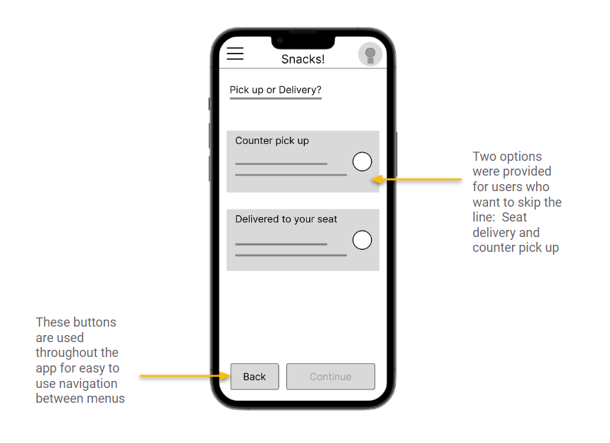 The Goal: Design a mobile feature in the The Movies! App that allows users to order snacks for direct delivery to their seat(s), or skip the line and pick up their order from the counter when it’s ready.