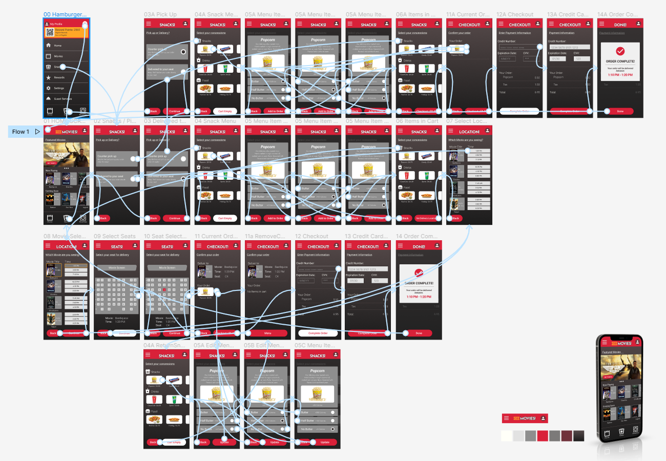 The high-fidelity prototype allows the user to order popcorn for delivery or pick up at the concessions counter. It also allows for item customization and easy menu navigation.