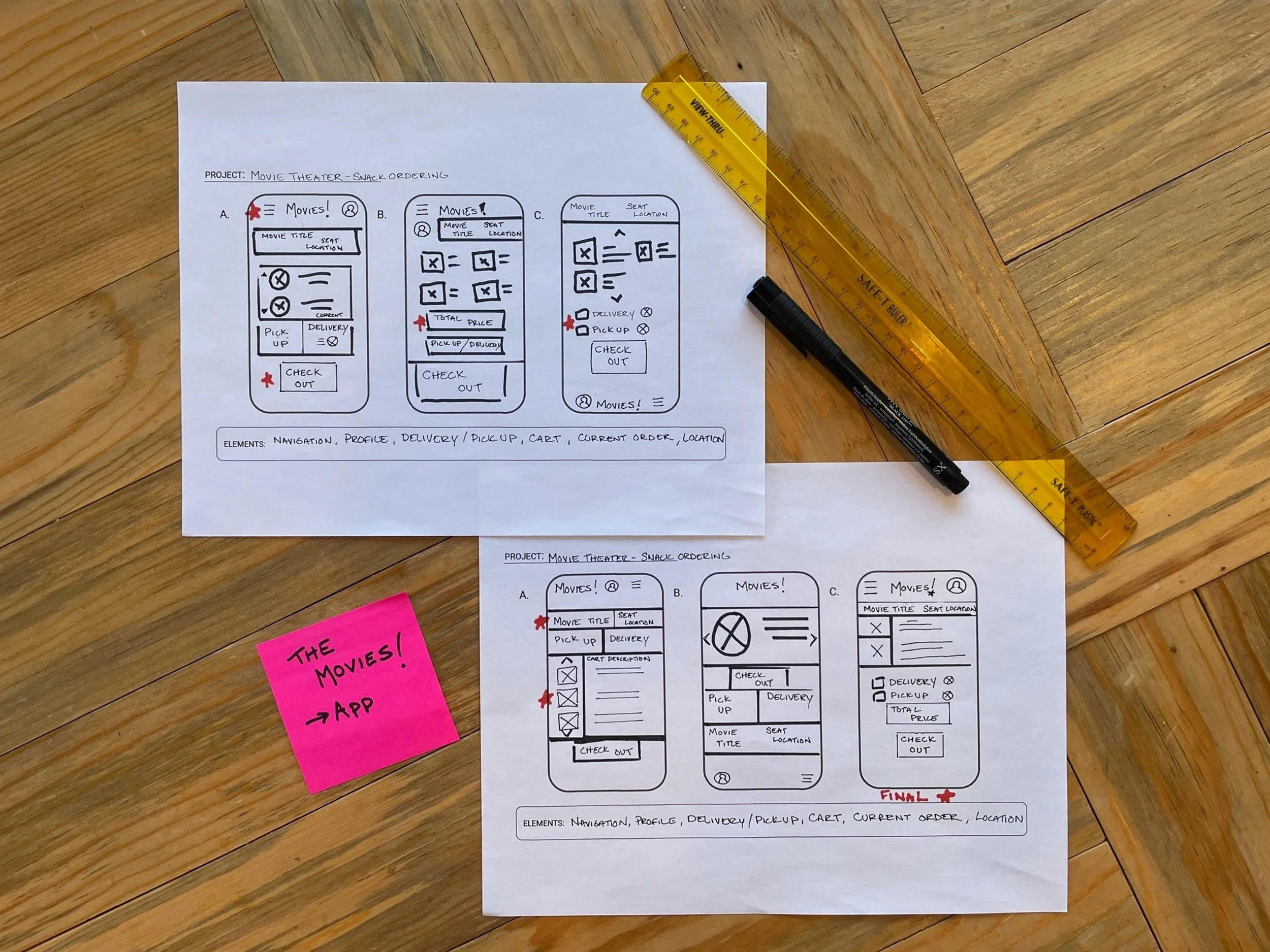 Iterations of each screen and their functionality were drafted on paper, to ensure the digital wireframes met the users wants and needs. For optimal access, two pathways exist to access the snack menu. One entry point is on the home screen, and another on the hamburger menu.