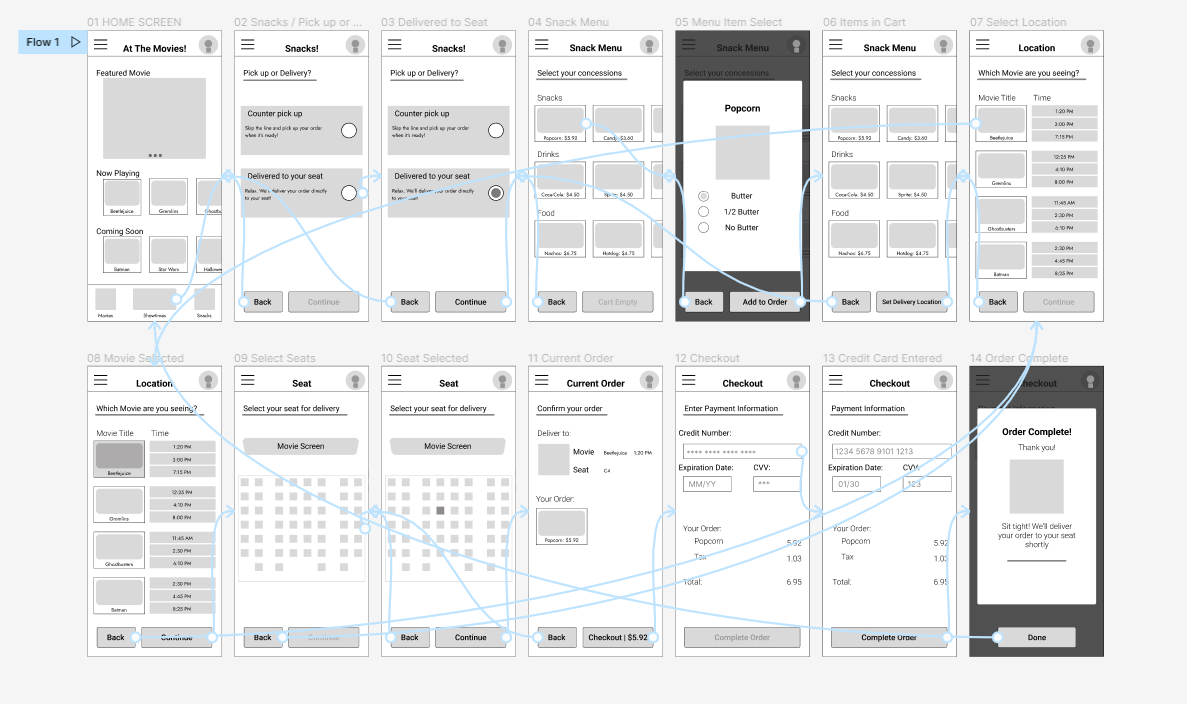 This low-fidelity prototype creates a user flow for ordering snacks at the movie theater and having them delivered directly to the user’s seat. This prototype was built as a usability study to get user feedback.