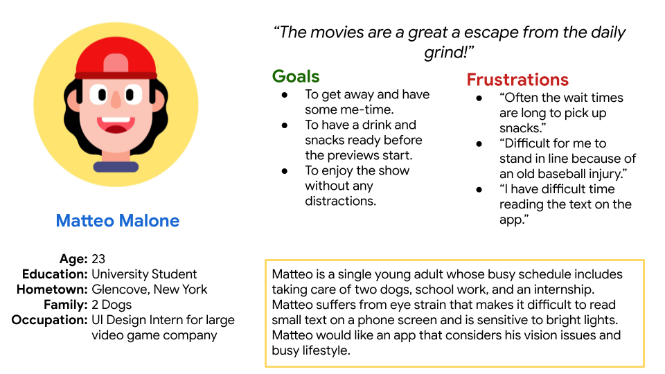 Building personas based on research helped identify the user’s needs. Matteo had difficult waiting in line to order snacks. It was determined that a delivery system could be included in the app to alleviate this specific pain point.