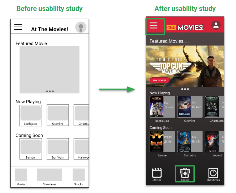 The first usability study revealed the snack menu was a bit difficult to locate. To address this pain point, I created a set of icons for the main menu flow and moved the snack option to the middle. I also added a link to the snack menu in the hamburger menu.