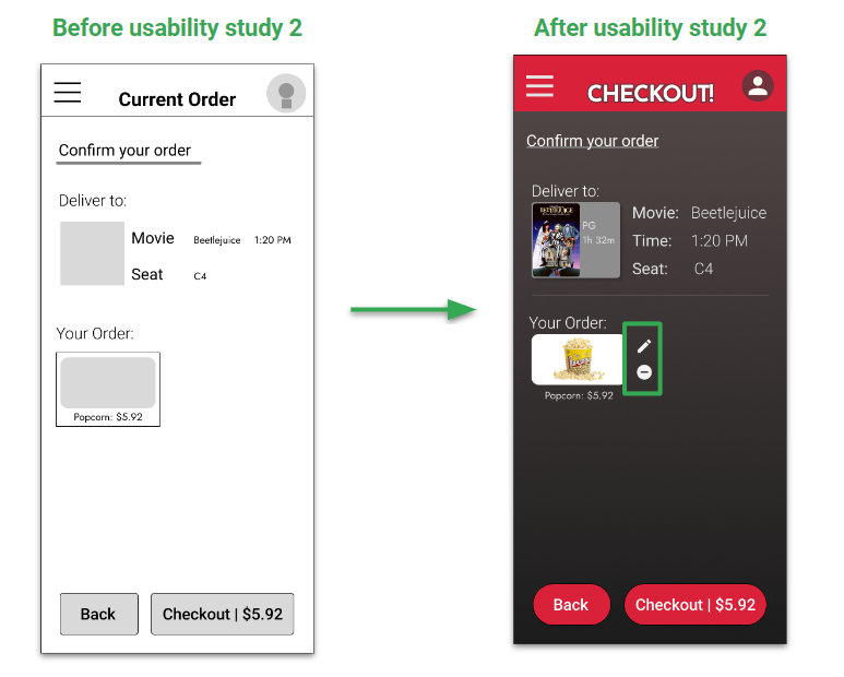 Before the second usability study, I allowed users to edit their orders by clicking the image in their cart. However - based on negative user feedback, I revised the design by adding an edit icon and a remove icon.