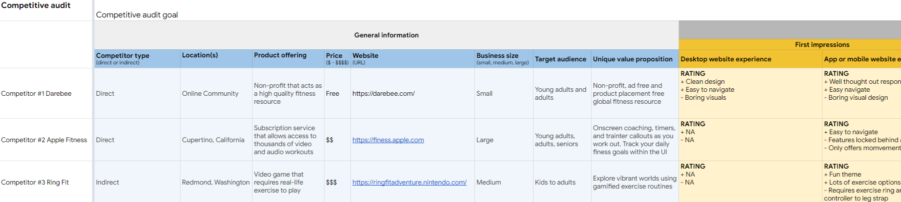 An audit on competitor’s websites and apps was conducted. This research helped identify areas and opportunities to improve on the exercise space.