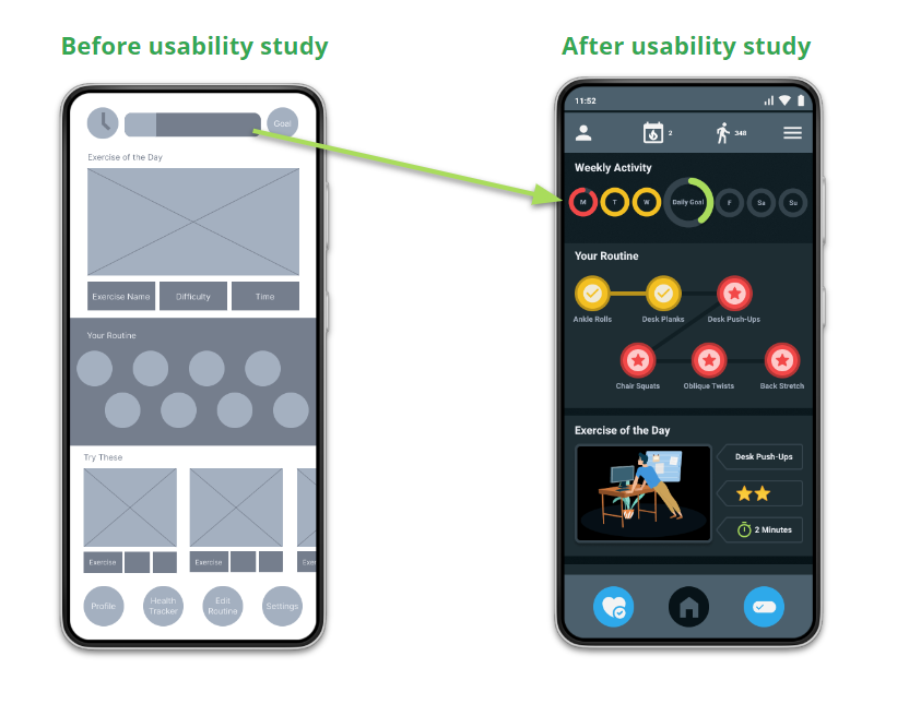 Based on insights from the usability study certain UI elements were modified to provide clarity. For example, the daily activity tracker was updated to differentiate its look from the activity timer. Additionally the ability to see weekly progress was added to the home screen.